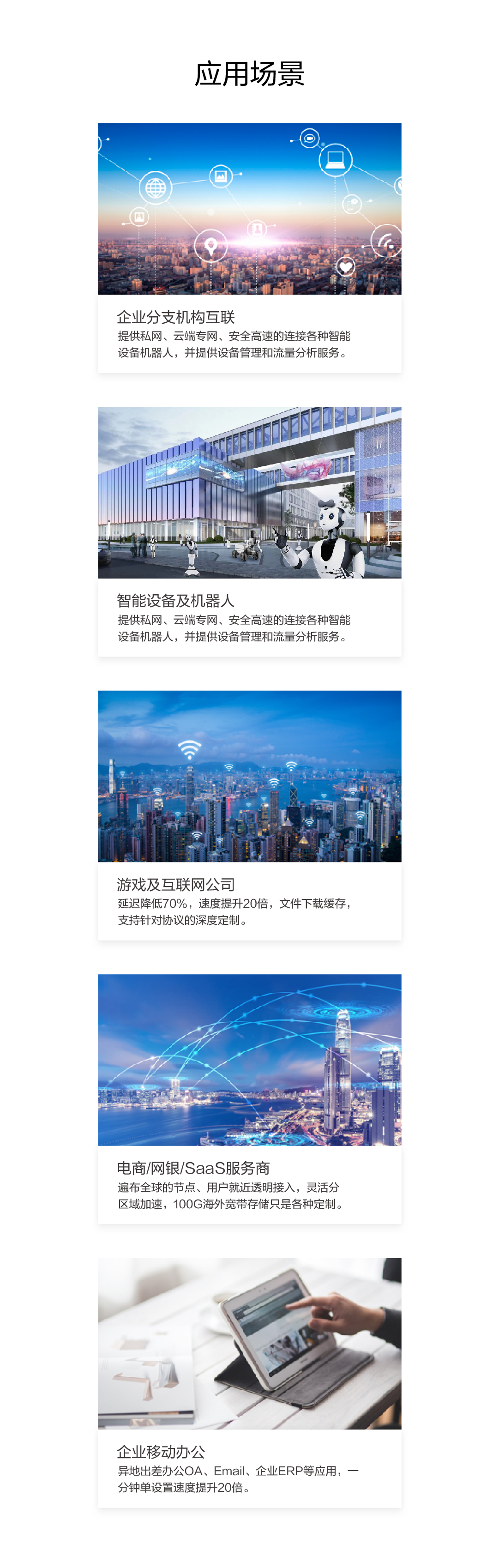 智能设备及机器人 提供私网、云端专网、安全高速的连接各种智能设备机器人,并提供设备管理和流量分析服务。
